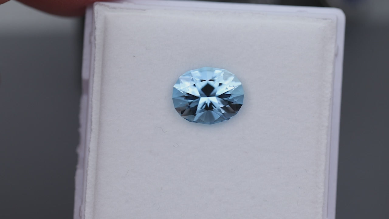 Ein Aquamarin mittlerer Sättigung aus Mosambik. Präzise geschliffen in unserem modernen Ovalschliff, besticht er durch bemerkenswerte Brillanz.