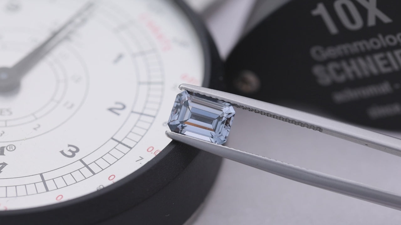 Ein eleganter stahlgrauer Spinell im Smaragdschliff mit mittlerer Sättigung.