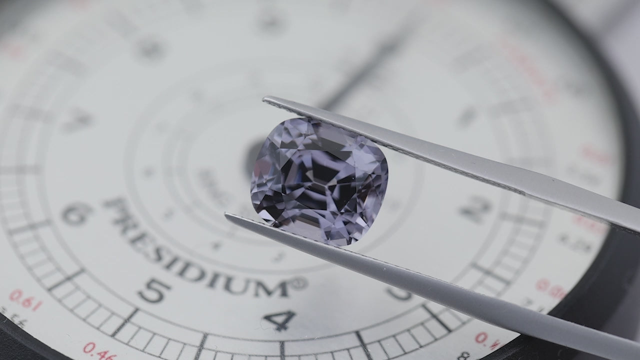 An exceptional grey spinel, cut into a traditional cushion shape.