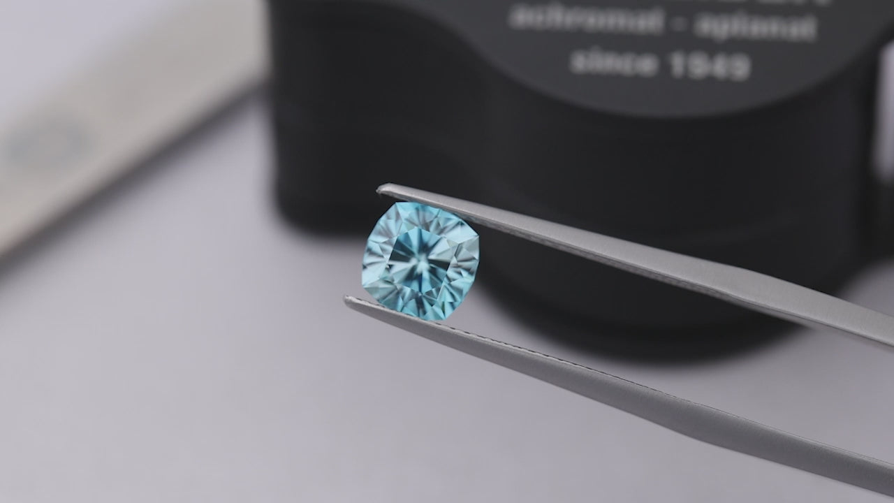 Ein modernes, präzisionsgeschliffenes blaues Zirkonkissen aus der traditionellen Lagerstätte in Kambodscha.