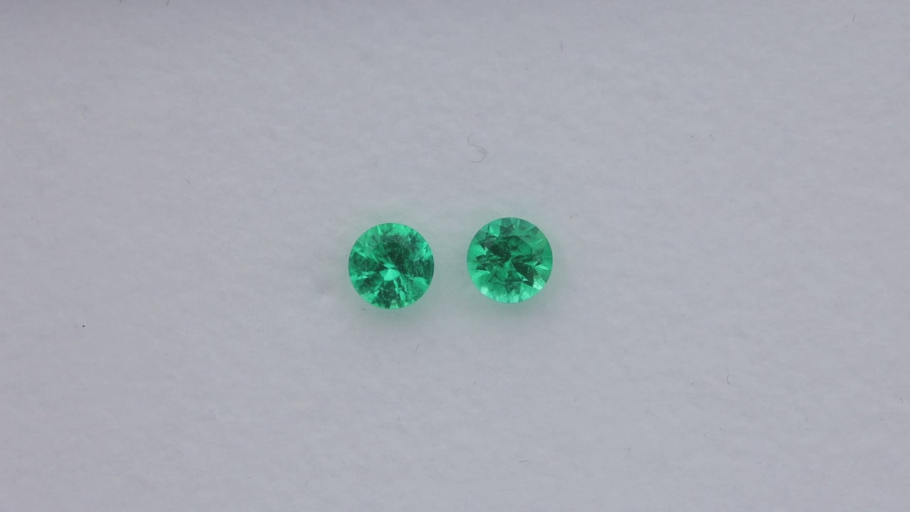 The camera can`t capture the exact tone of these beautiful emeralds. This pair is very vivid green with a slight blue secondarya. A perfect emerald pair in our opinion.