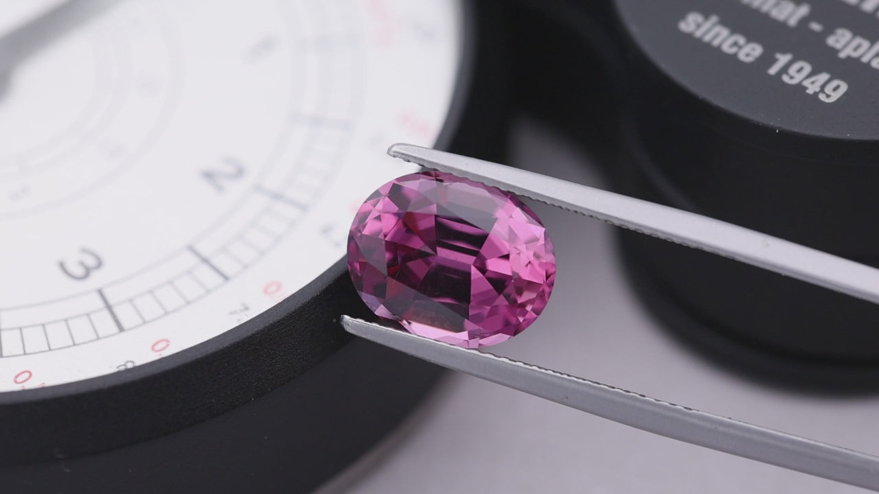 An oval, mixed step-cut pinkish Malaya garnet from the Umba Valley. The small rutile needles are very difficult to see with the naked eye.