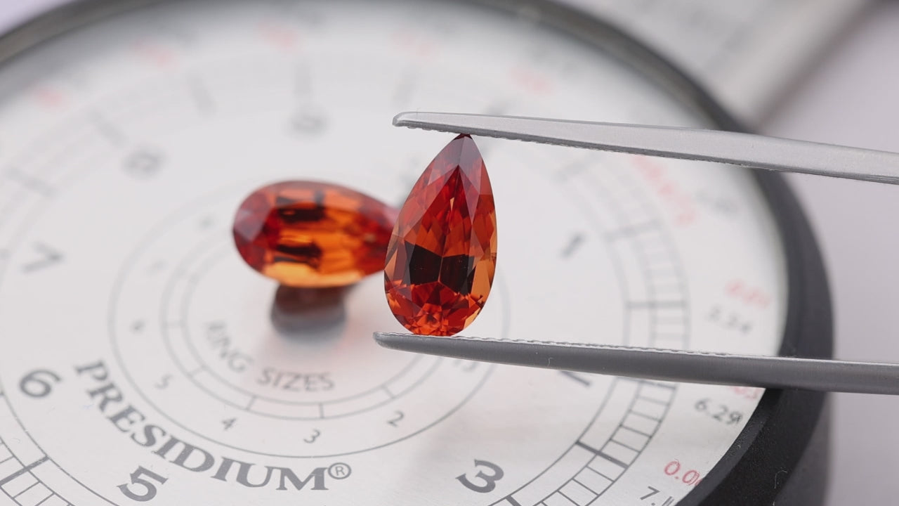 A pair of precision cut fiery orange Malaya Garnets from the original deposit in the Umba Valley, Tanzania.