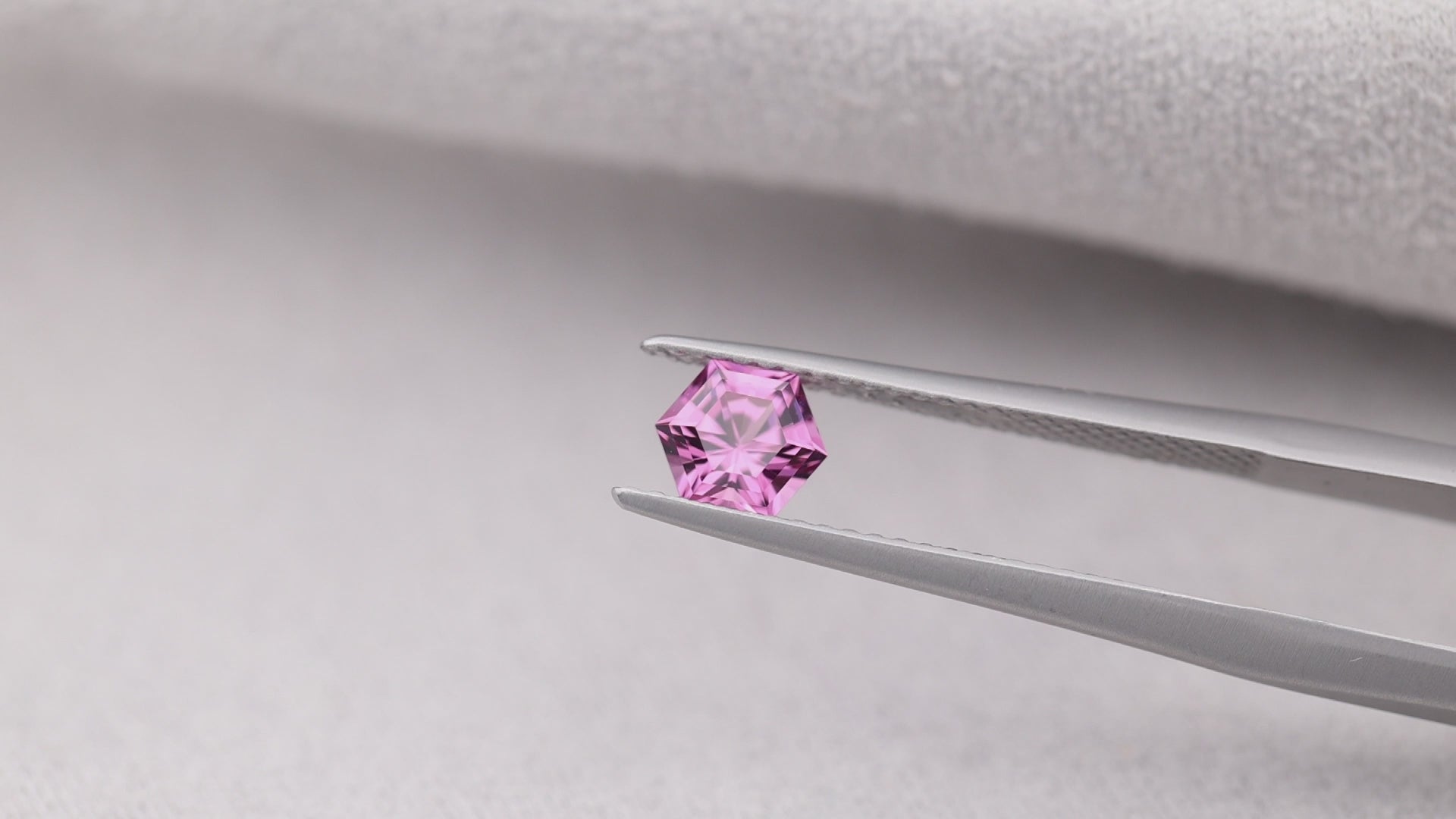 An exceptional bright pink garnet from the 2024 Tanga, Tanzania find, cut in a contemporary hexagon design.