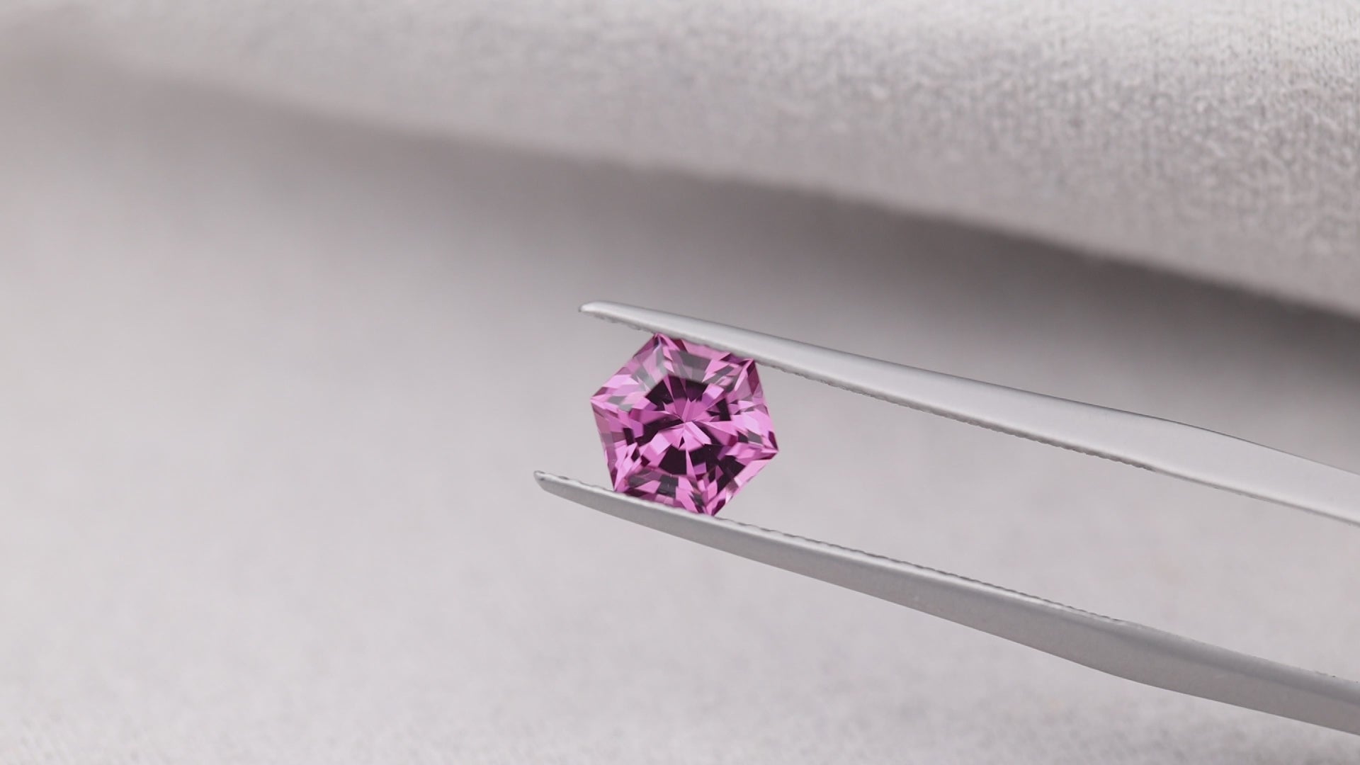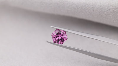 An exceptional bright pink garnet from the 2024 Tanga, Tanzania find, cut in a contemporary hexagon design.