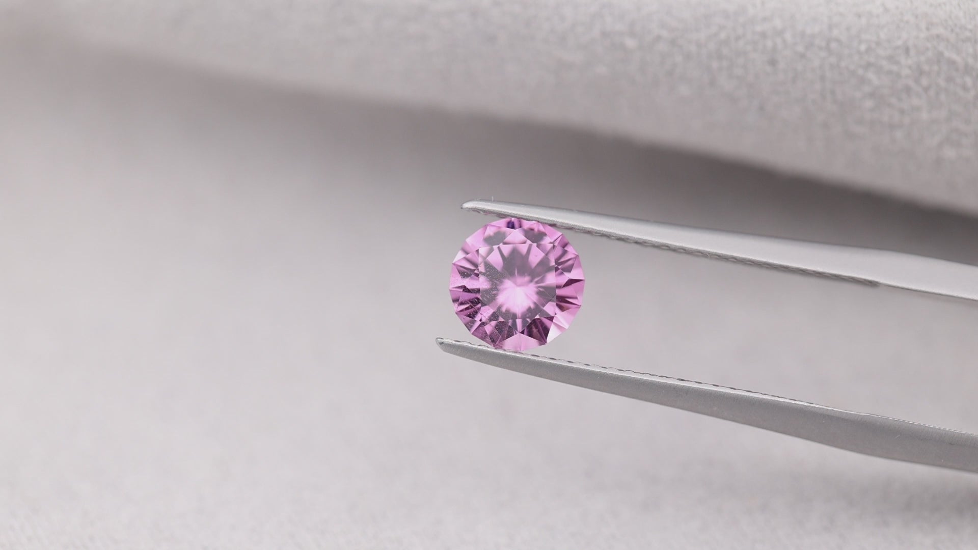 A bright, nearly pastel pink garnet from the 2024 Tanga, Tanzania find, displaying exceptional brilliance from its round brilliant design.