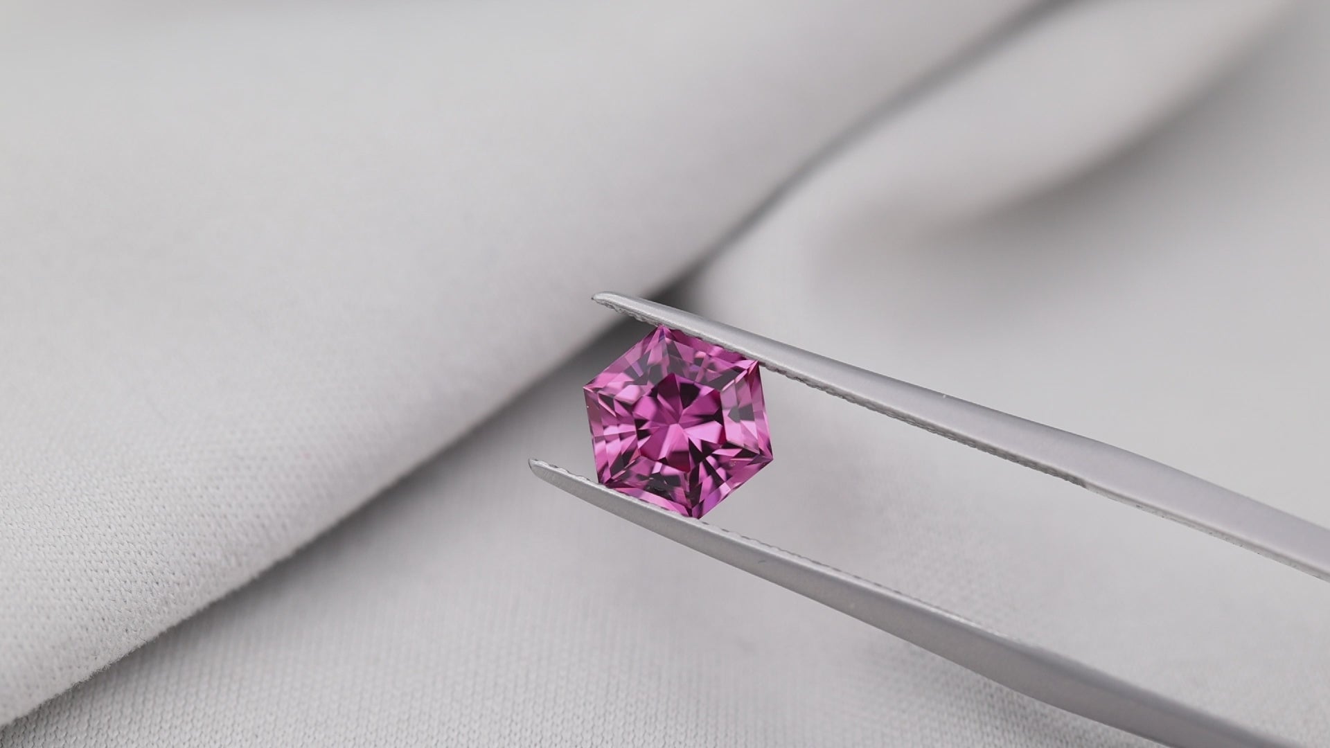 A very bright pink garnet from the 2024 Tanga, Tanzania find, precision-cut in our contemporary hexagon design.