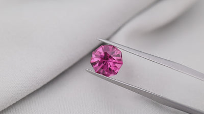 A fantastic, light-saturated pink garnet from Tanga, Tanzania, cut in a contemporary trillion-inspired design.