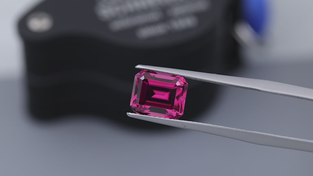 An exceptional, bright rhodolite from the classic Umba Valley deposit in Tanzania. Well-sized and finely cut into an emerald cut.