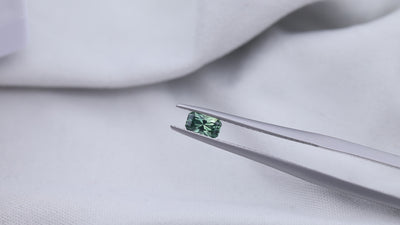 An unheated green sapphire from small-scale mining in Gombe, Nigeria, cut into our elongated radiant emerald cut.