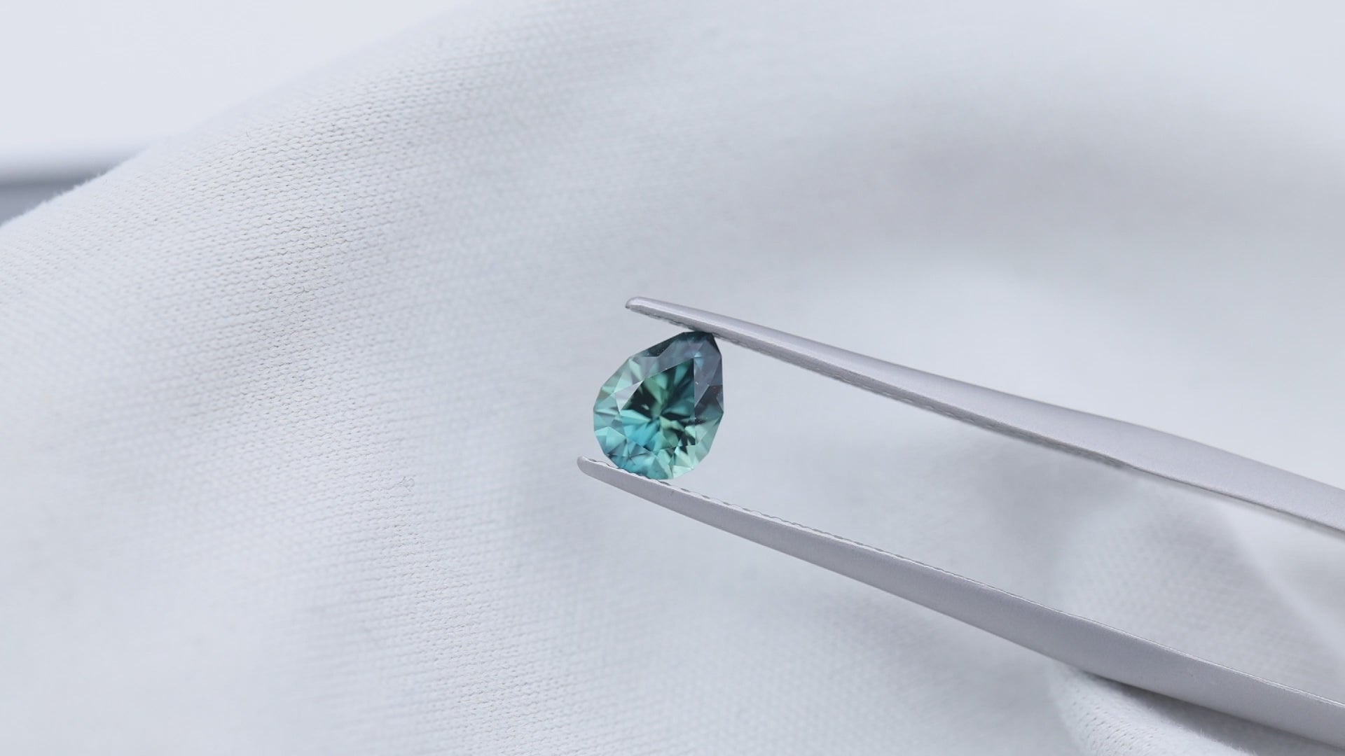 A fine parti-to-teal sapphire from small-scale mining in northern Madagascar. Cut into a contemporary pear!