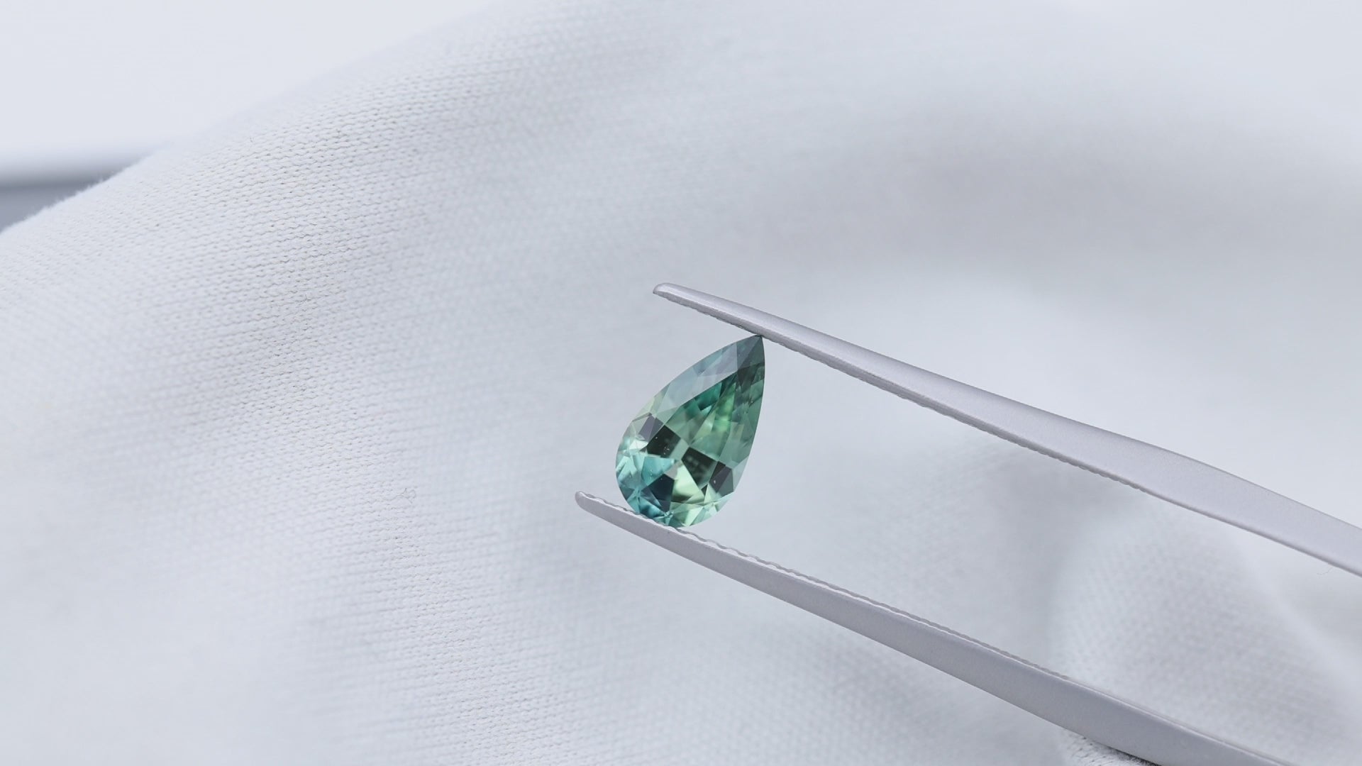 A fine parti-to-teal sapphire from small-scale mining in northern Madagascar. Cut into an elongated pear.