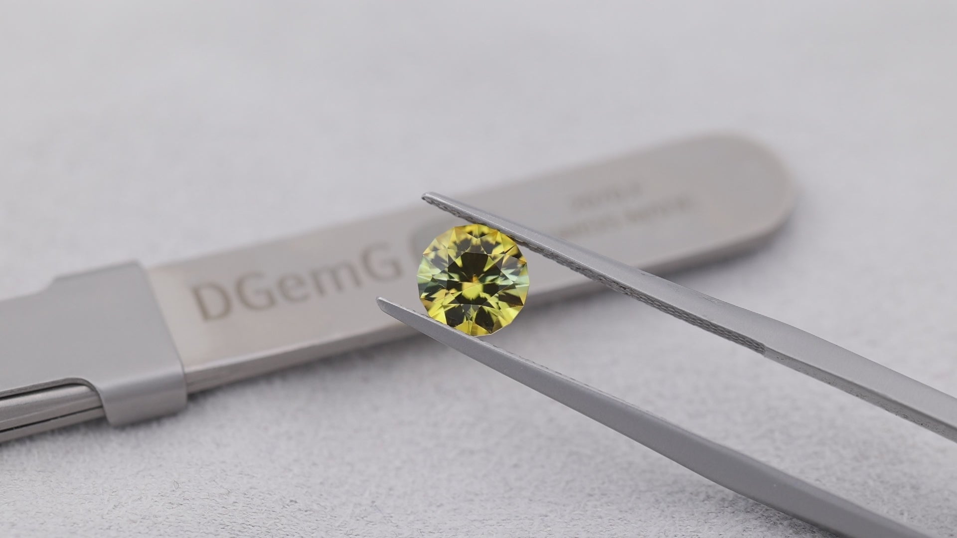 A one-of-a-kind sapphire, showcasing a very rare color combination and precision-cut in a round brilliant shape.