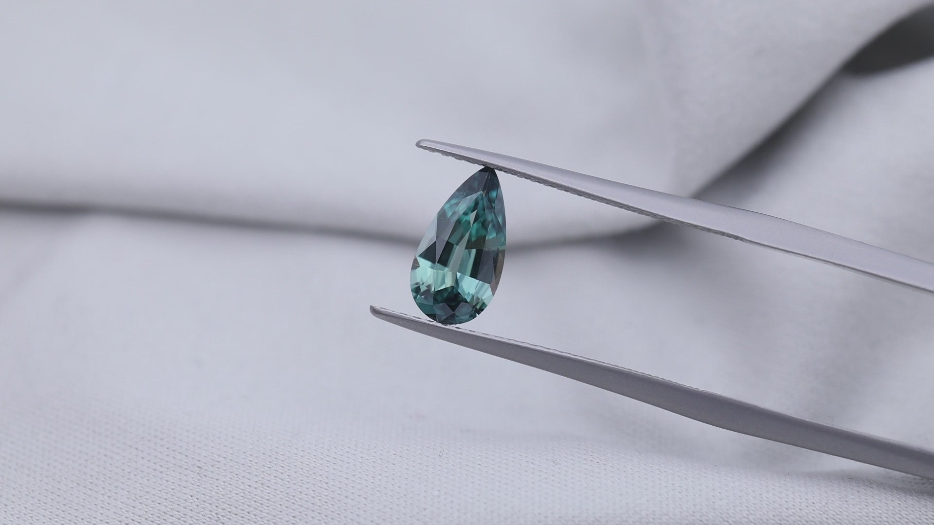 A fine unheated teal sapphire, sourced from small-scale mining in Gombe, Nigeria.