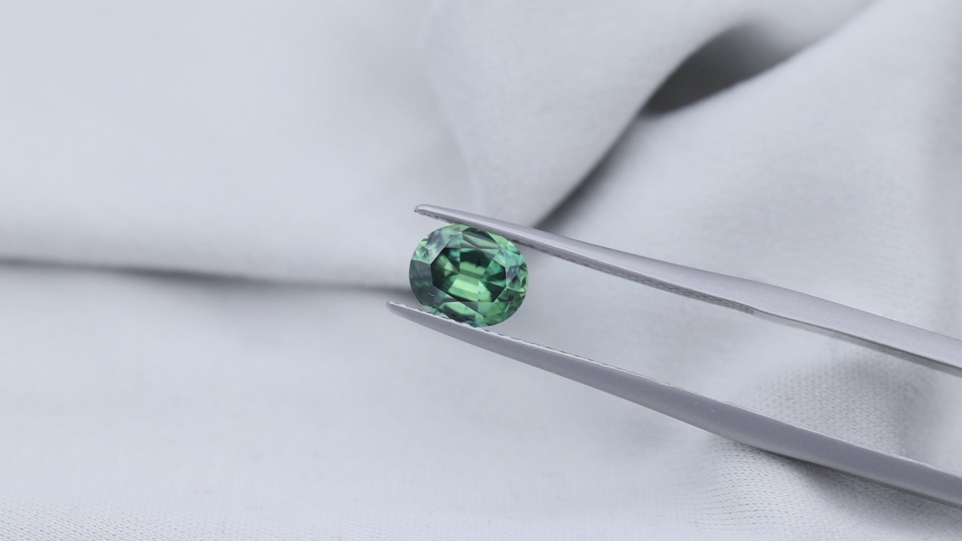 A fine unheated green sapphire from small-scale mining in northern Madagascar. What you see in the photos and videos are not inclusions, but striking blue color zones.