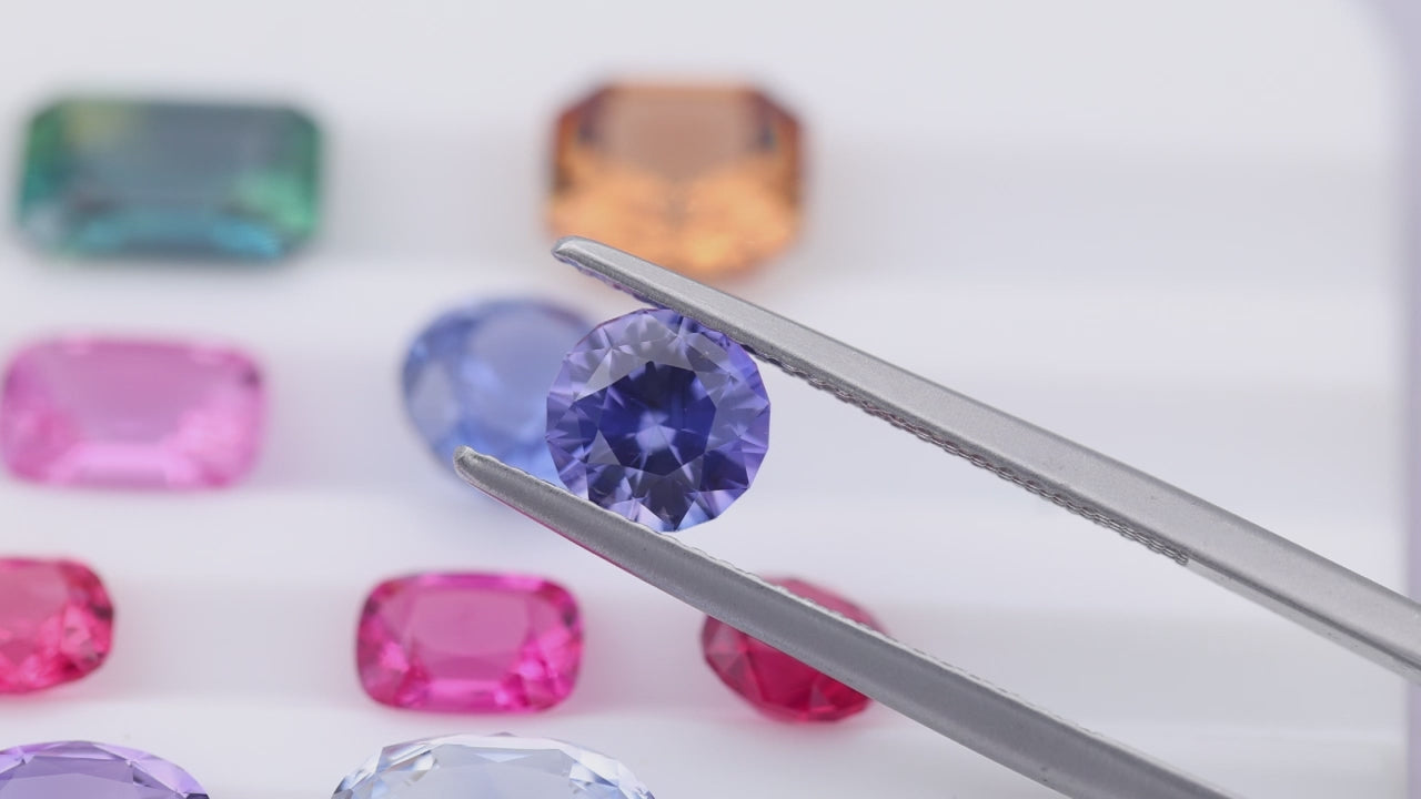 A precision cut round sapphire. Blue with a slight purplish secondary hue.