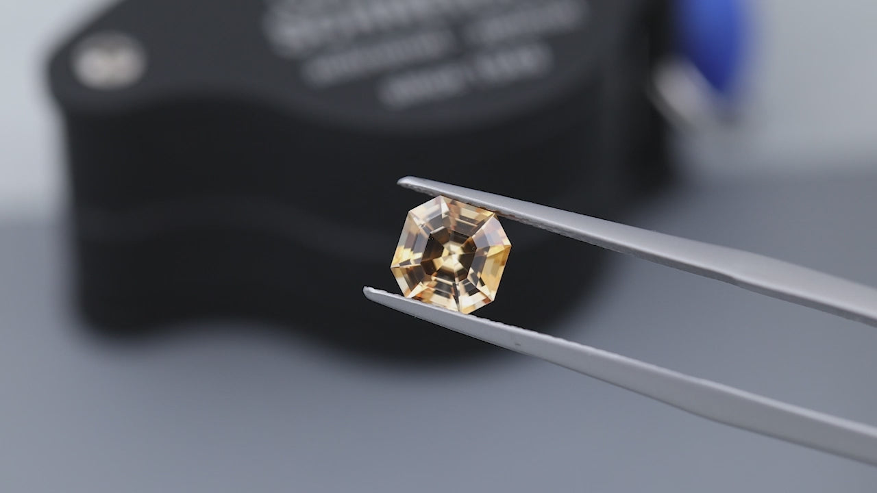 A remarkable Asscher-cut sapphire in a peachy orange hue.