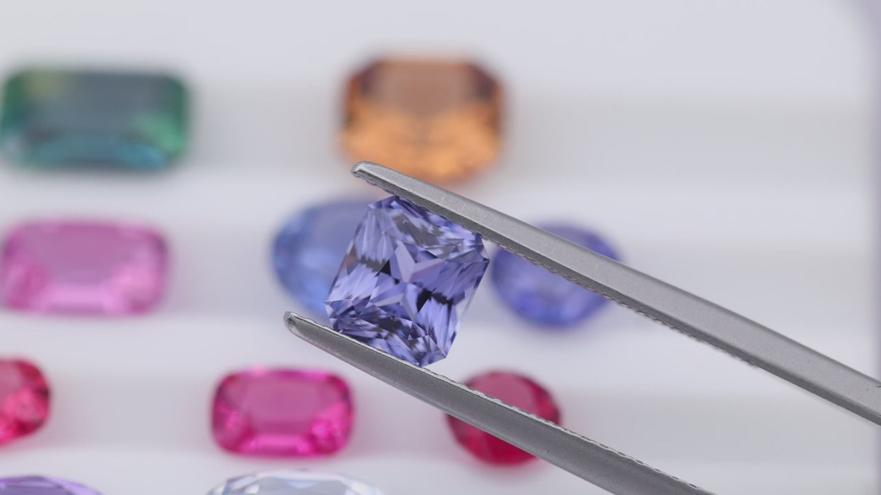 A fine purplish blue sapphire, precision cut into an emerald radiant.