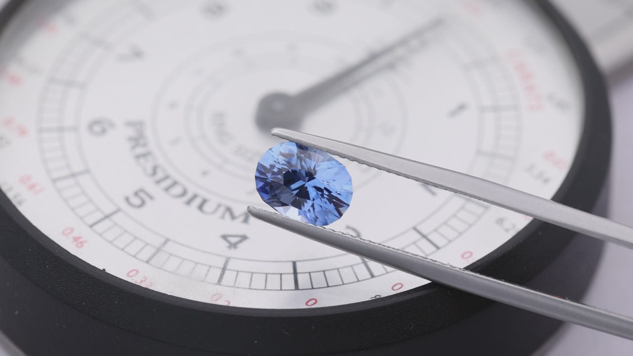 A medium blue sapphire from Madagascar. This precision-cut gem is crafted into a contemporary oval shape, highlighting its sparkle and color.