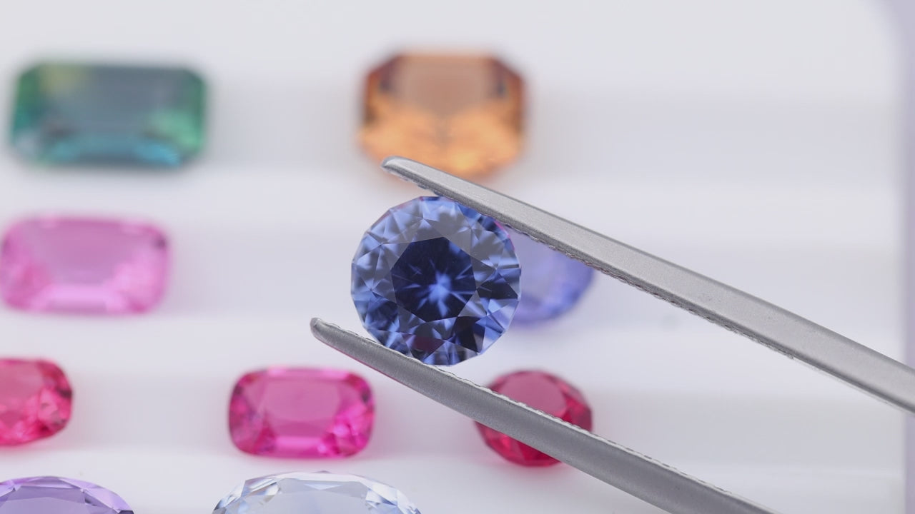 A precision cut round sapphire. Blue with a slight purplish secondary hue.