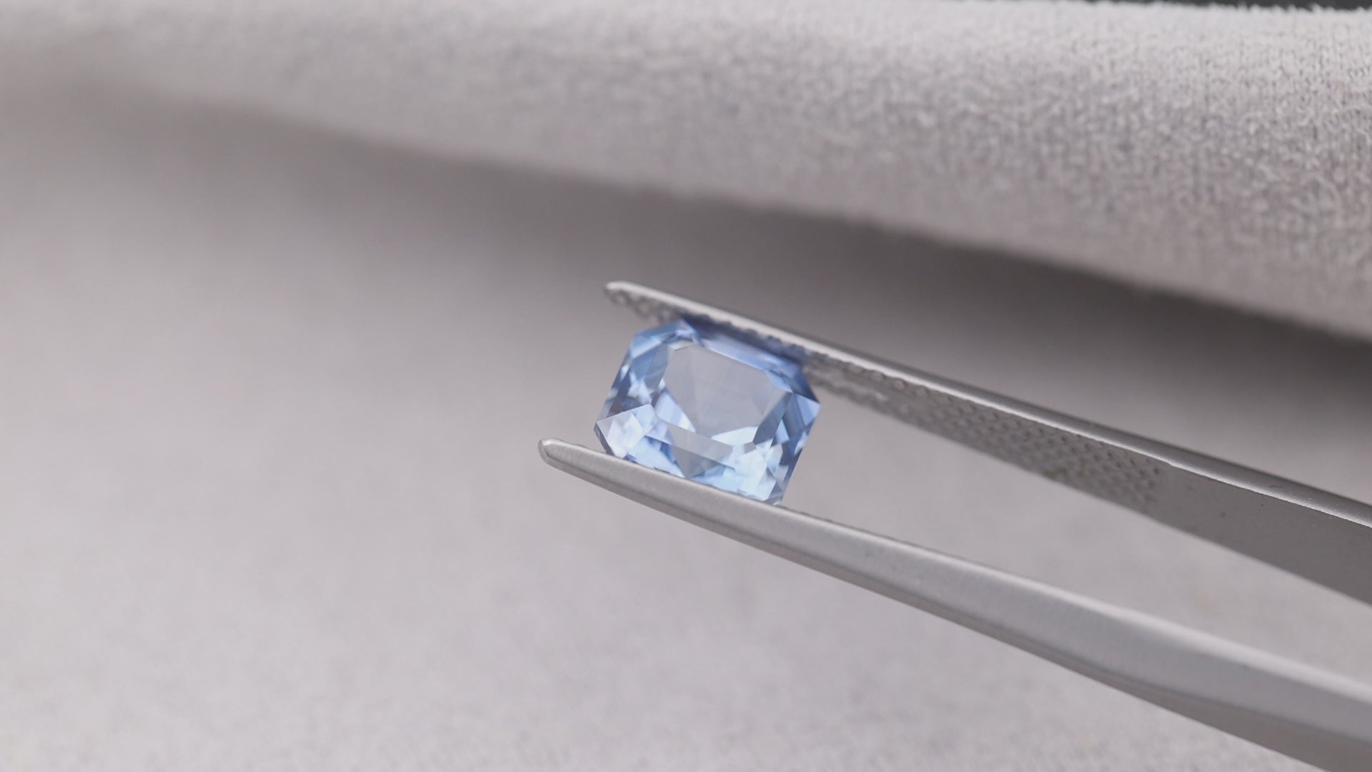 An elegant Asscher-cut blue sapphire from small-scale mining in Madagascar.