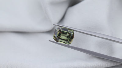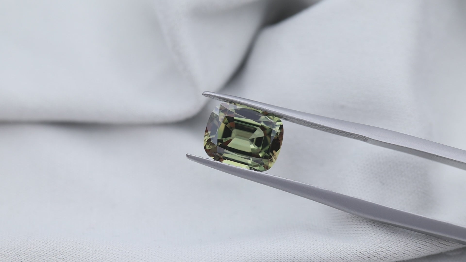 A very special colored sapphire from Songea, Tanzania. This exquisite gem has been cut into a classic cushion shape. It displays a greenish hue in daylight, shifting to a pinkish tone under incandescent light.