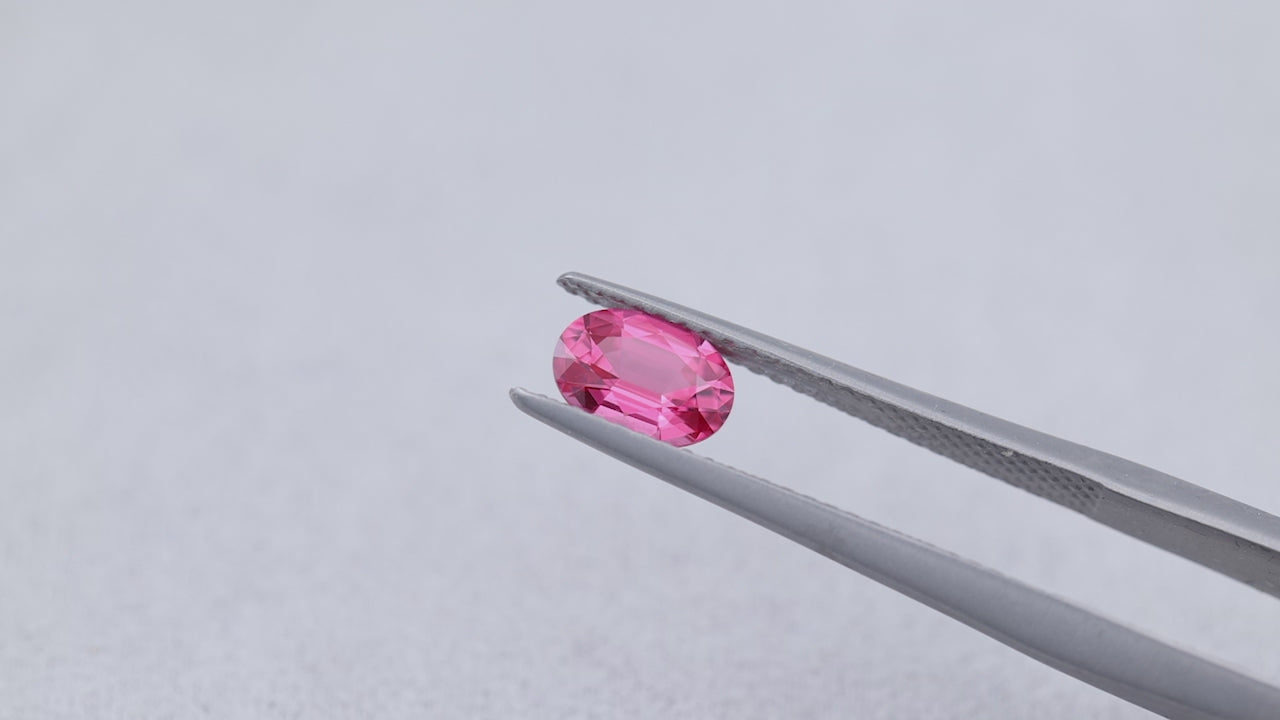 A glowing pink spinel from Mahenge, Tanzania. Cut into our traditional oval.