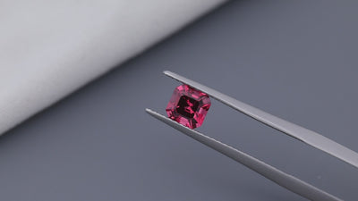 A fine pure red spinel from small-scale mining in Luc Yen, Vietnam. Cut into an elegant Asscher shape.