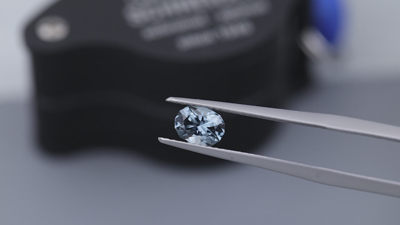 An elegant grey spinel from Mozambique, cut into our contemporary oval. Very brilliant stone.