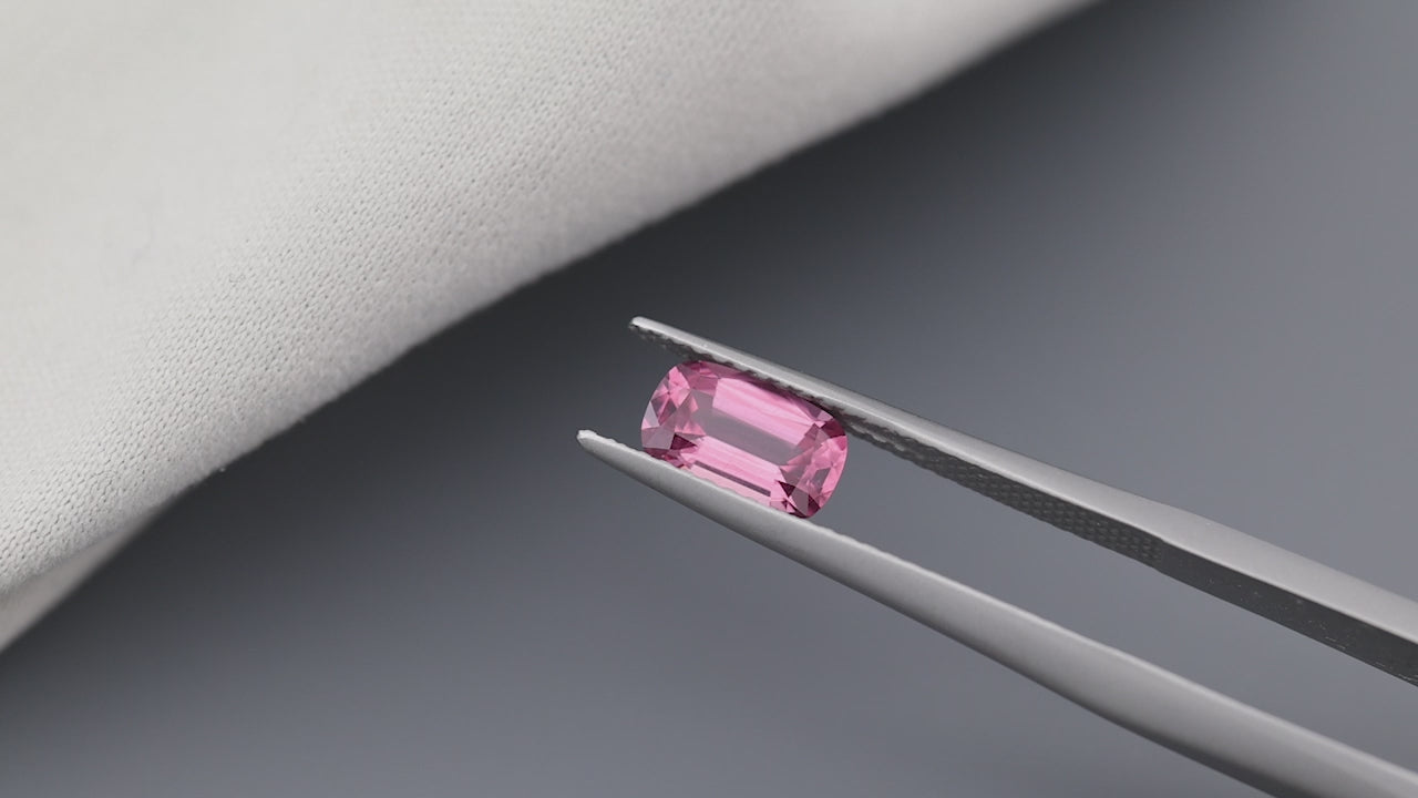 A fine pink spinel from small-scale mining in Luc Yen, Vietnam. Cut into a classic cushion.