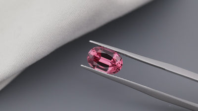 A top-class orangey-pink spinel from small-scale mining in Luc Yen, Vietnam. Featuring top-grade cutting quality, it’s cut into a traditional oval shape.