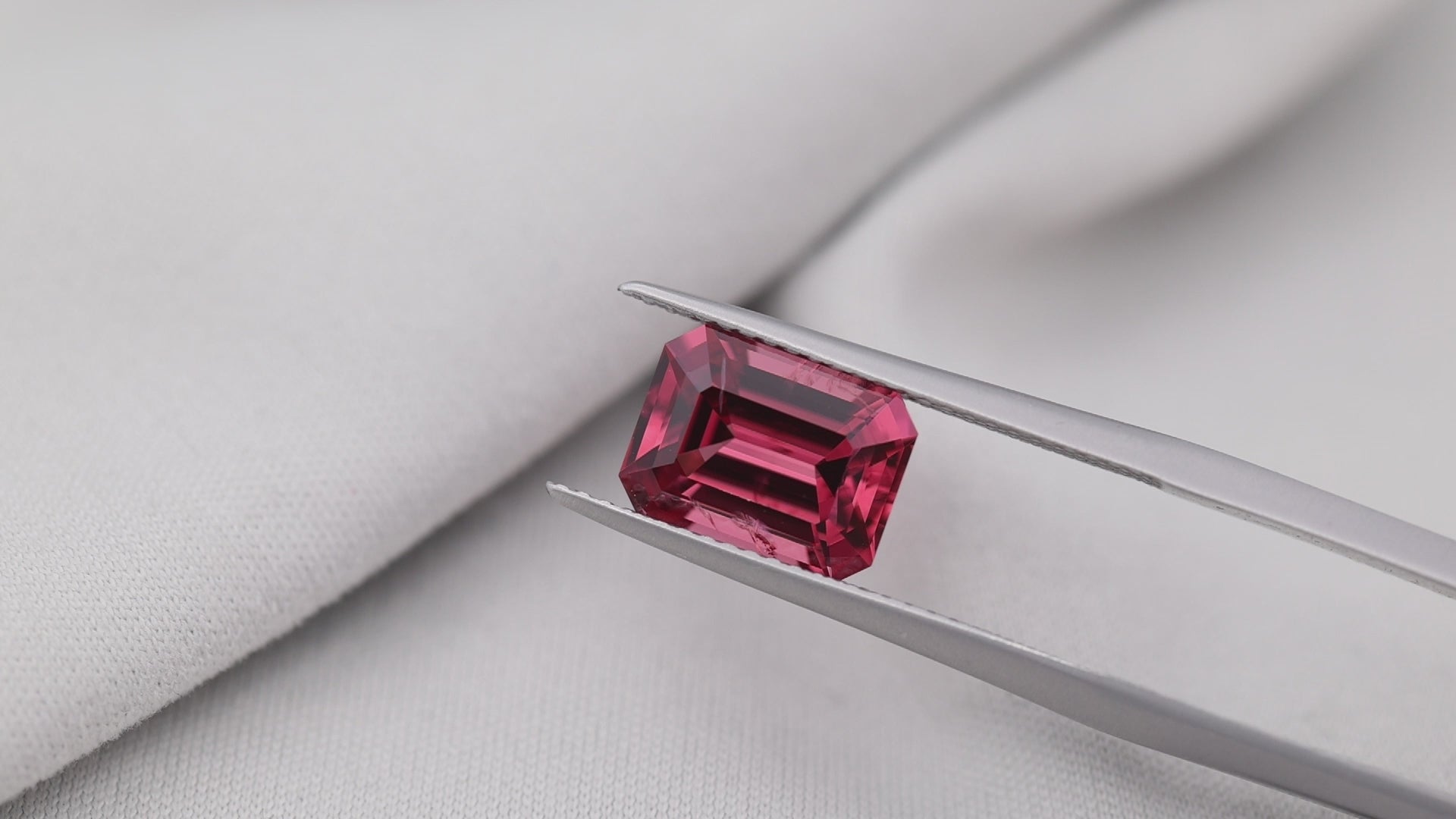 A large emerald-cut spinel from Luc Yen, Vietnam. This gem contains small inclusions, but they do not detract from its beauty or its exceptional color.