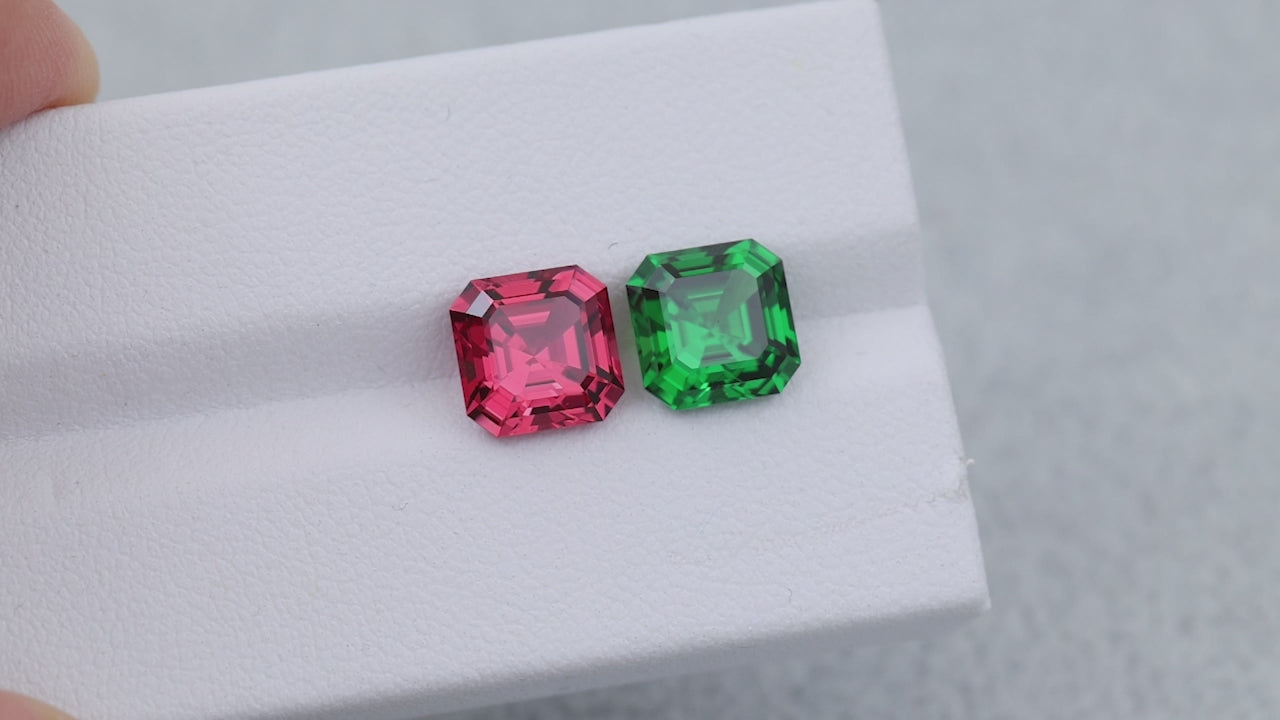 Discover a truly one-of-a-kind gemstone pairing — a perfectly mismatched set featuring a fine pink Spinel from Luc Yen, Vietnam, and a vibrant green Tsavorite from Kenya. Both gems are expertly faceted in a flawless Asscher cut, known for its elegant step facets and timeless geometry. What makes this duo extraordinary is their identical dimensions, creating a visually balanced yet striking contrast of color. A rare find for collectors, designers, or anyone seeking a unique expression of bold elegance.