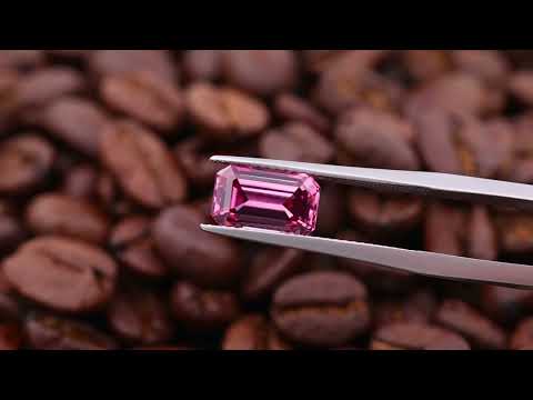 A very well-sized and super bright pink garnet from Tanga, Tanzania. This stone slightly color-shifts from pink to a soft peachy pink depending on the light. Very elegant in a perfectly executed emerald cut.