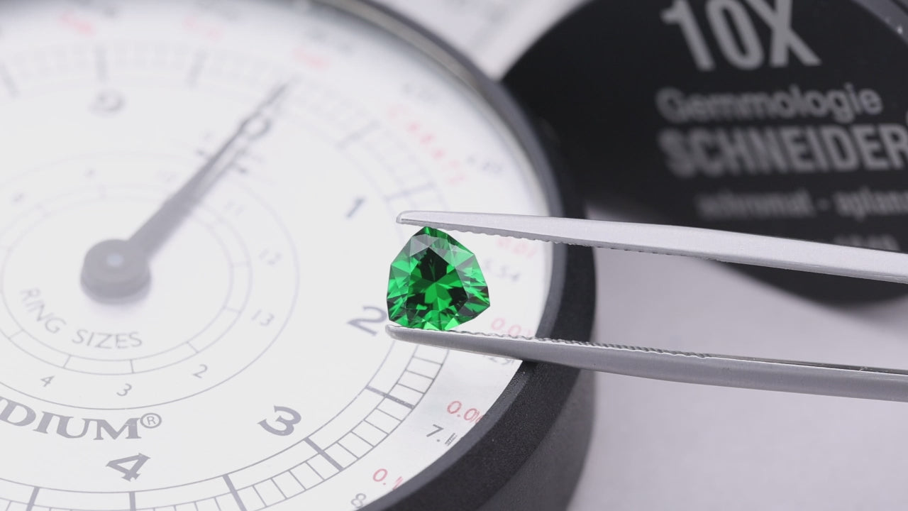 A top-color tsavorite from Kenya, featuring a modern trillion cut with fantastic brilliance. It is an amazing size for a ring.