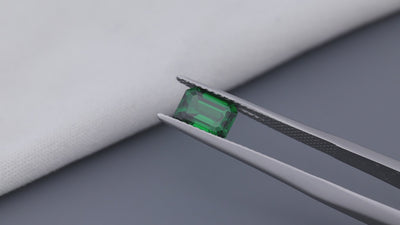 A strongly saturated tsavorite from small-scale mining in Kenya, cut into a classic emerald cut.