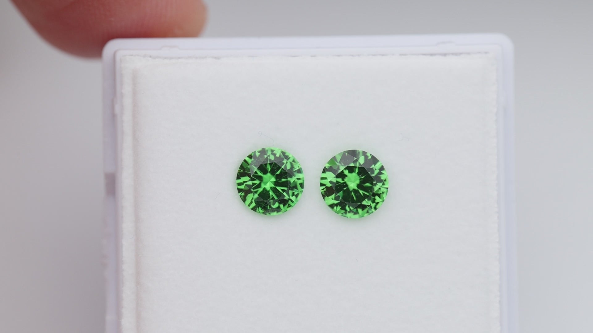A pair of fine green tsavorites. Brilliant cut. Minor inclusions, nearly eye-clean.