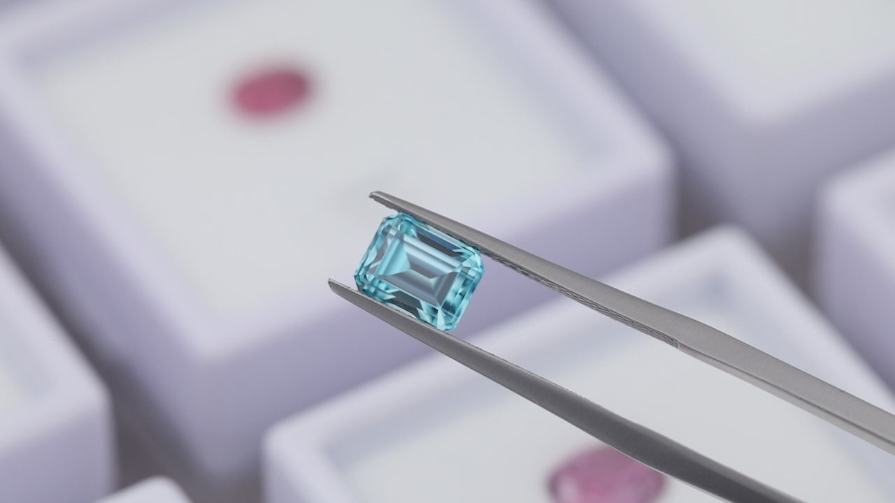 An elegant emerald cut blue zircon from the traditional deposit in Cambodia.